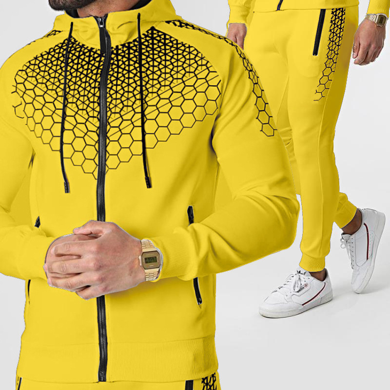 Men's hooded jacket electronic honeycomb printed casual trousers suit men fitted tracksuit sports jogging wear