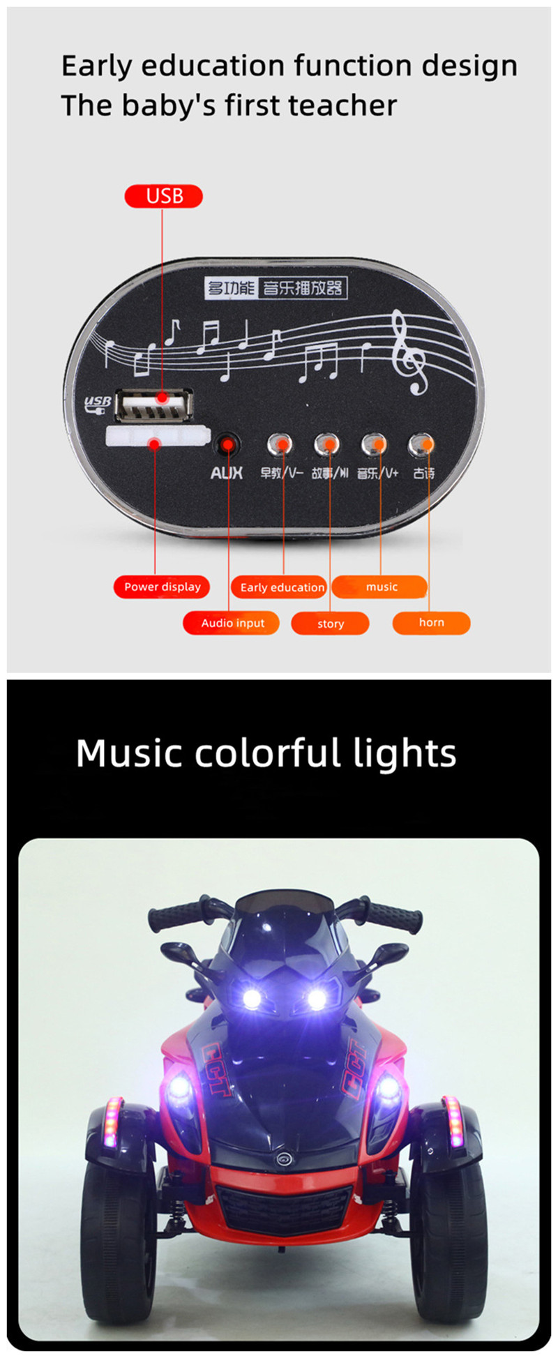 1) One key to start, battery display. 2) Puzzle early education function, ancient poems, English, Internet celebrity songs, with multiple music. 3) Simulation headlights on the front of the car, dynamic dazzling lights. 4) Double electric double drive [two 6V4 batteries in series]. 5) Suitable for 3-7 year old baby, the maximum load is 50 kg. 6) Endurance 10 kilometers. 7) Anti-rollover. 8) USB socket, MP3 socket.